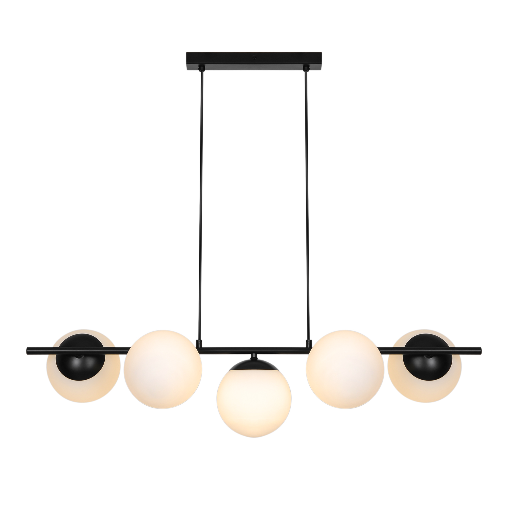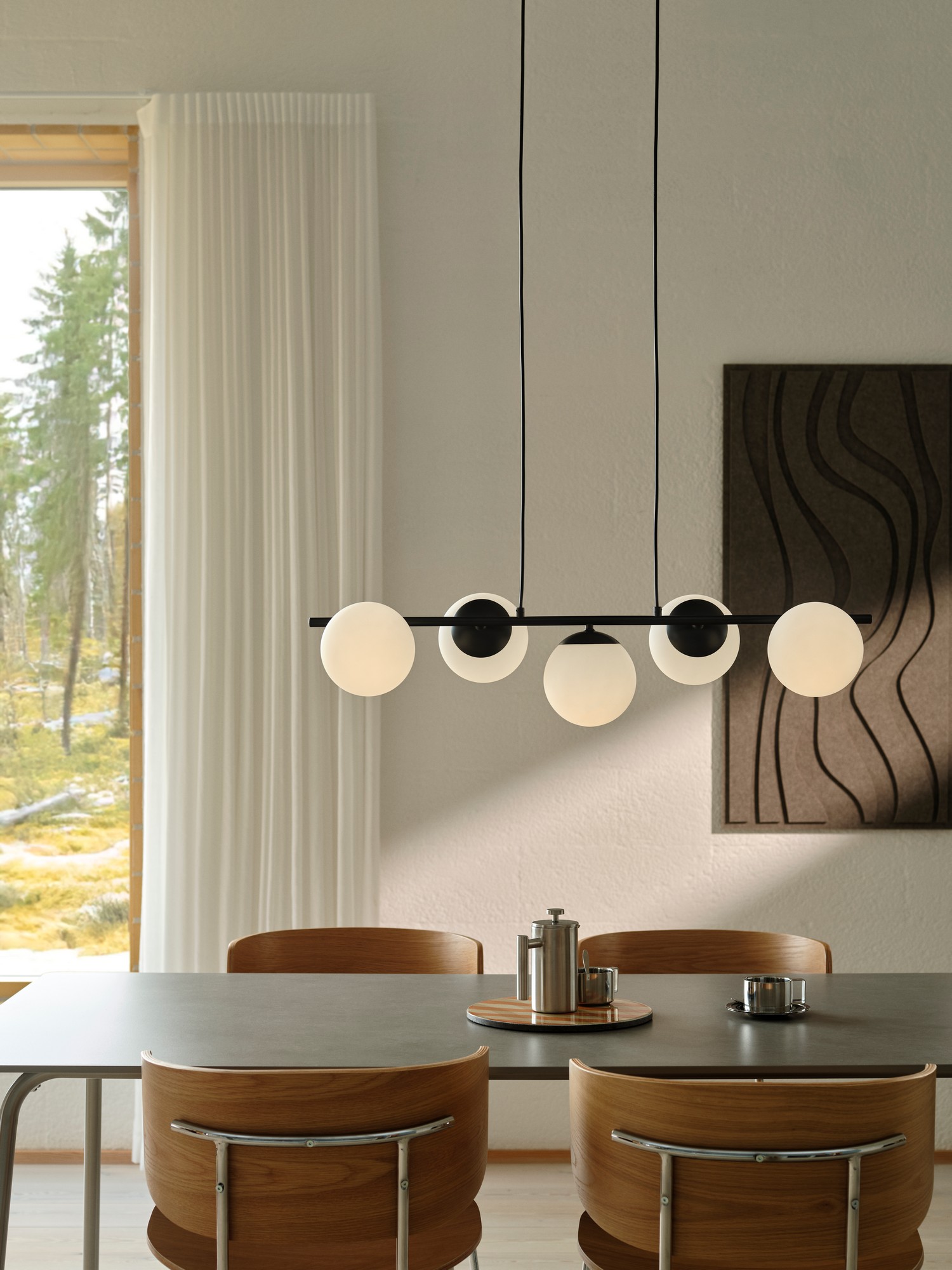 Kombinationen af rene linjer og runde glasskærme skaber et raffineret og dekorativt udtryk, der passer perfekt over spisebordet eller i stuen.