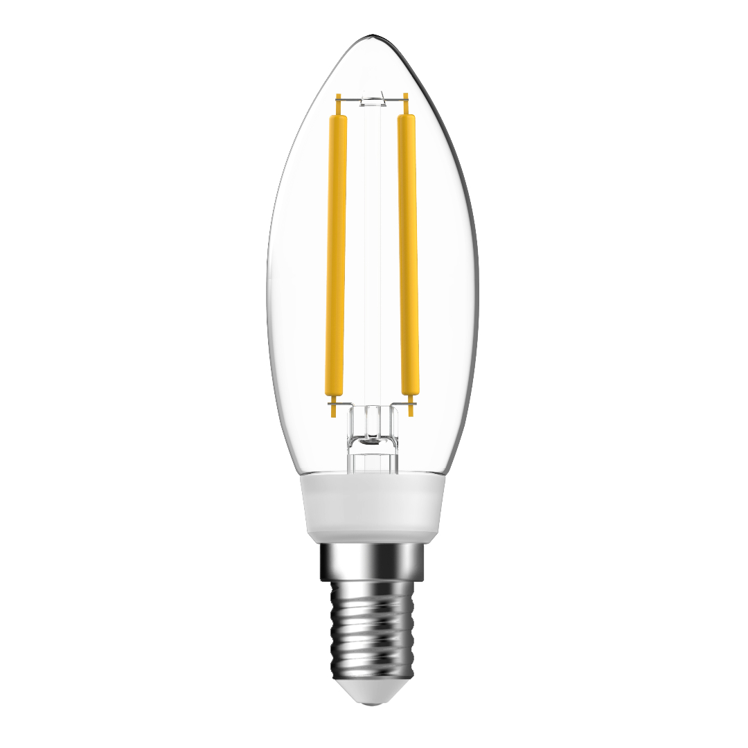 GlasKlar C35-pære med E14-fatning i varmt hvidt lys. Denne pære er vores mest energibesparende pære (energiklasse A) og har en ekstra lang levetid. Den har en bred strålevinkel, der giver en bred lysspredning i rummet.