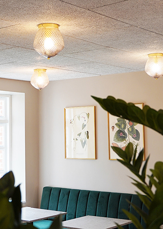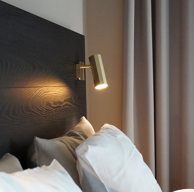 Several black Tilo pendants hang in straight lines above the tables in the bar and restaurant area, creating a modern and streamlined look. In the guest rooms, Alanis and Ellen in brass create a warm and cosy ambience, while also providing a practical light for reading.