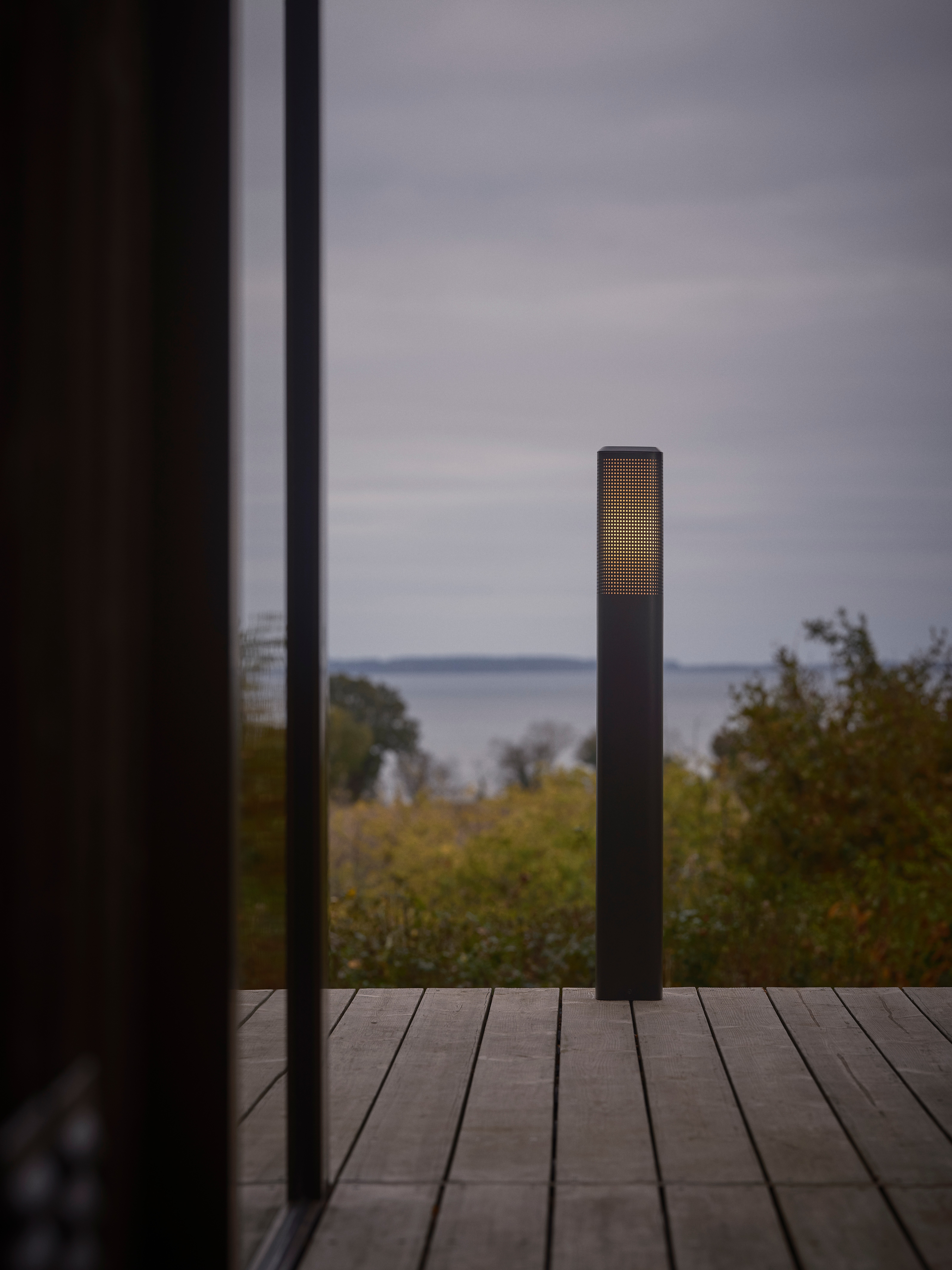 AluminiumBedlampen Sidara er designet av anerkjente Jacob Jensen Design og kombinerer moderne minimalisme med et raffinert, arkitektonisk uttrykk. Den perforerte overflaten skaper et vakkert spill mellom lys og skygge i uterommet. Lett å installere med den medfølgende basen.