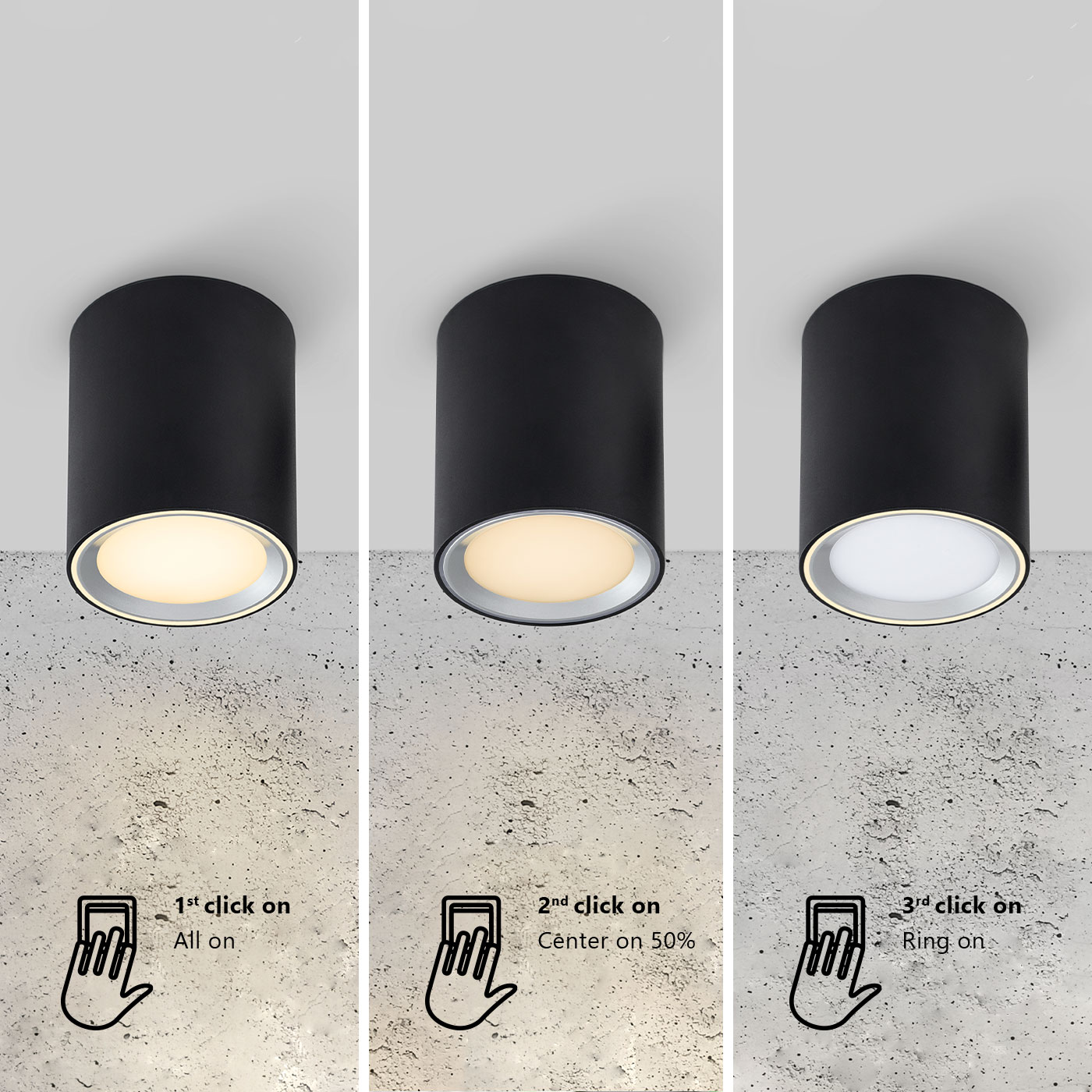 MetalLandon is a series of surface mounted downlights with a built-in Moodmaker™ functionality that dims the light in the inner and outer light ring in three different steps. The third step enables a dim night light that is perfect for illuminating the bathroom during the night. High IP protection (IP44) makes this downlight suitable for humid areas, such as the bathroom.