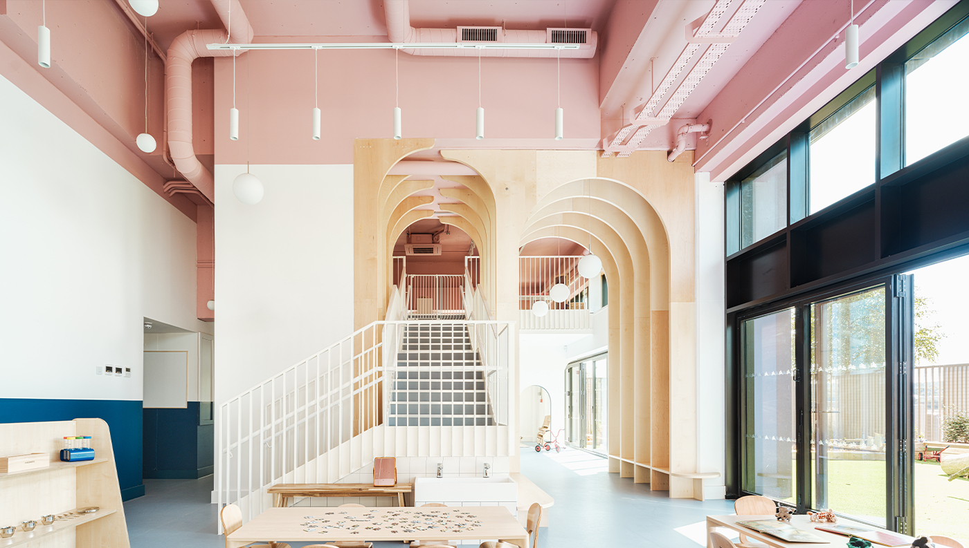 The Nest is the transformation of a vacant commercial unit into a colourful new nursery in Royal Wharf, East London. The Nest features durable design and natural materials that are sustainable, tactile and promote explorative play and learning.