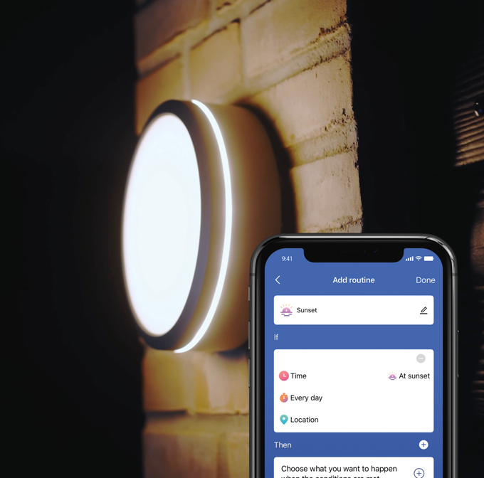 Nu kan du ställa in ljuset så att det tänds och släcks utifrån tidpunkten för soluppgång och solnedgång där du befinner dig*. Nordlux Smart-appen registrerar tidpunkten för soluppgång och solnedgång på din aktuella plats och ställer in ljuset enligt dina önskemål och behov.